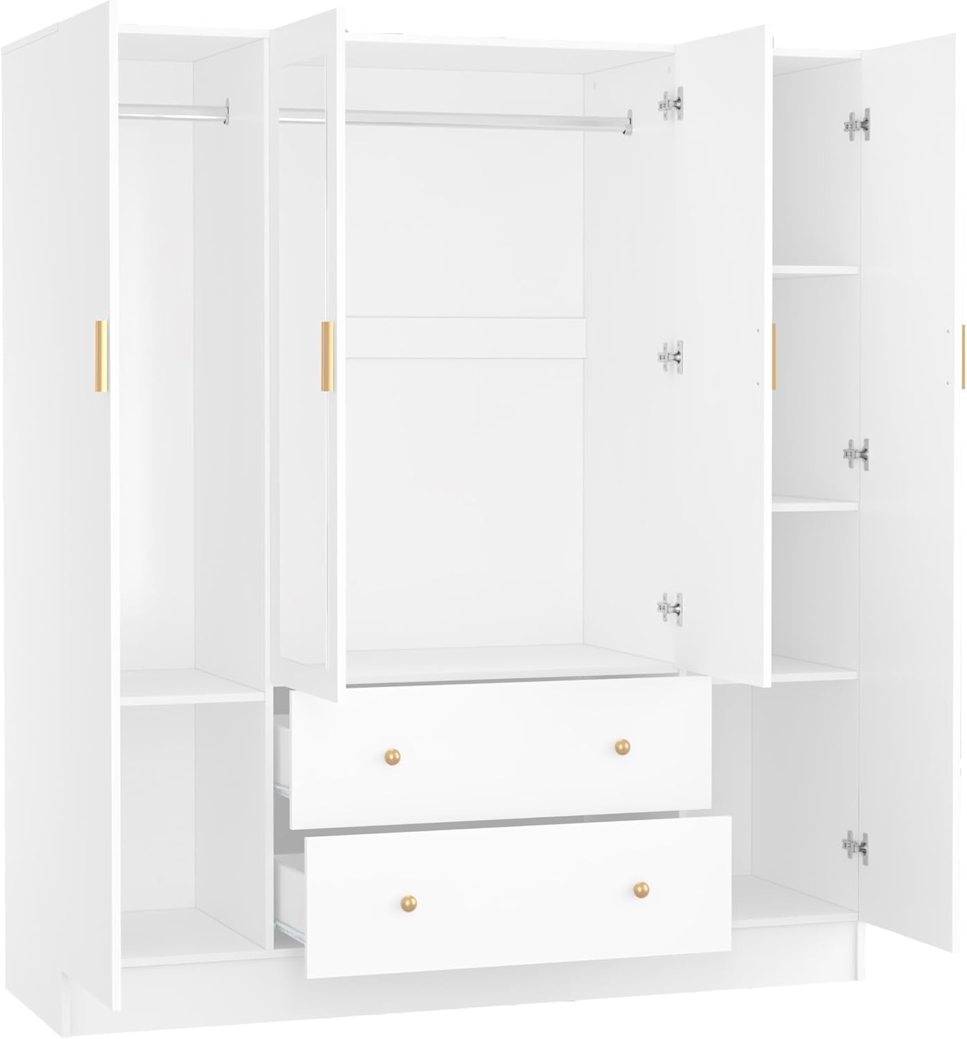 Este moderno armario de 4 puertas cuenta con un espejo de cuerpo entero y ofrece soluciones de almacenamiento versátiles con dos barras para colgar la ropa, cinco estantes para un almacenamiento organizado y dos amplios cajones en la parte inferior para artículos pequeños. La robusta superficie superior es perfecta para guardar maletas u otros objetos voluminosos, lo que lo convierte en un armario elegante y muy funcional para su dormitorio.