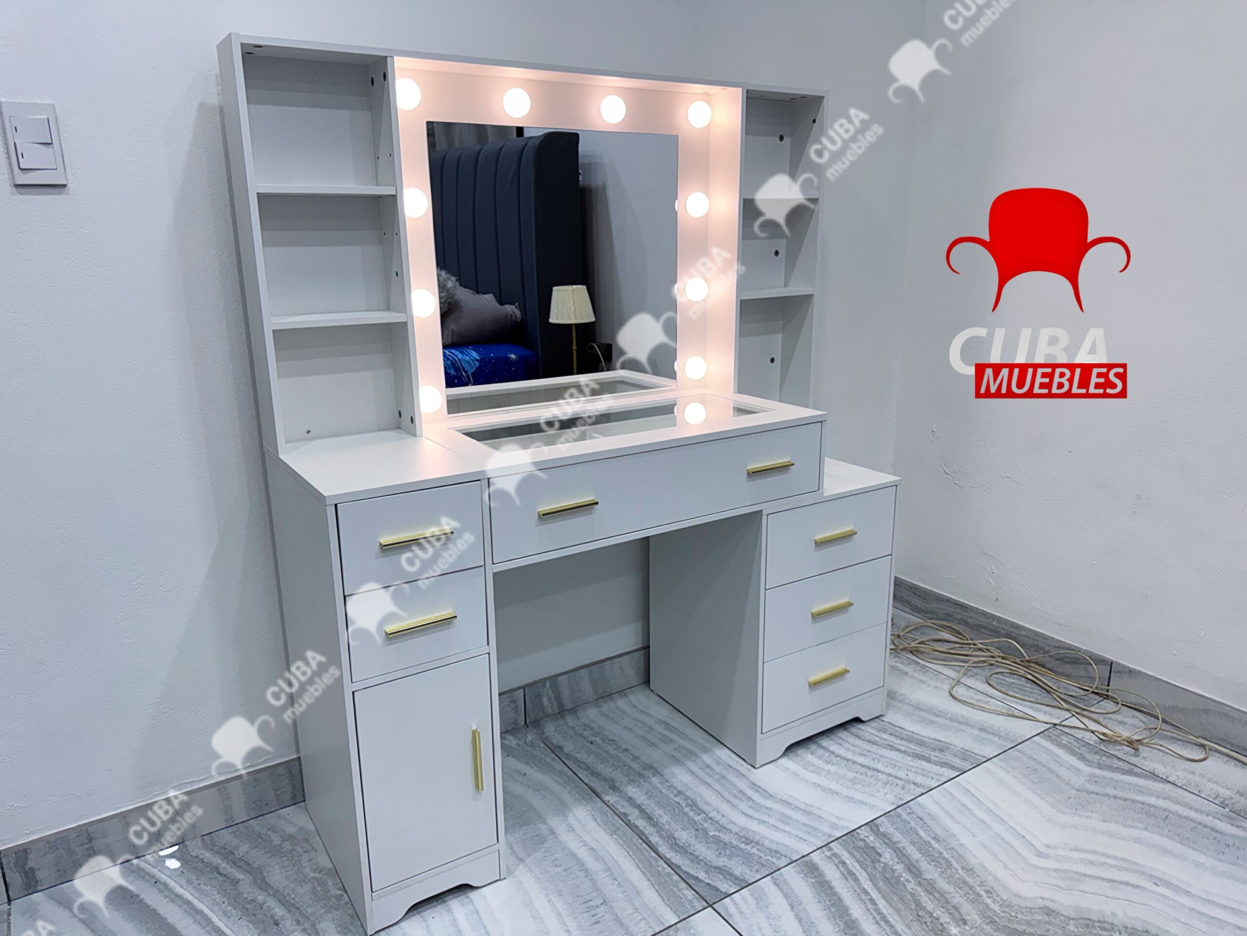 Escritorio de tocador moderno con espejo iluminado y escritorio de cristal, tocador de maquillaje con cajones, tocador de escritorio de maquillaje, borde redondo
